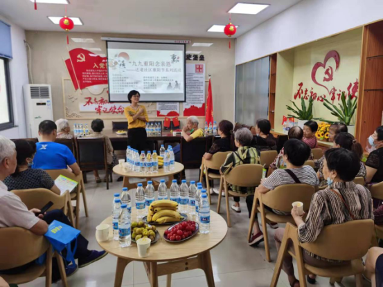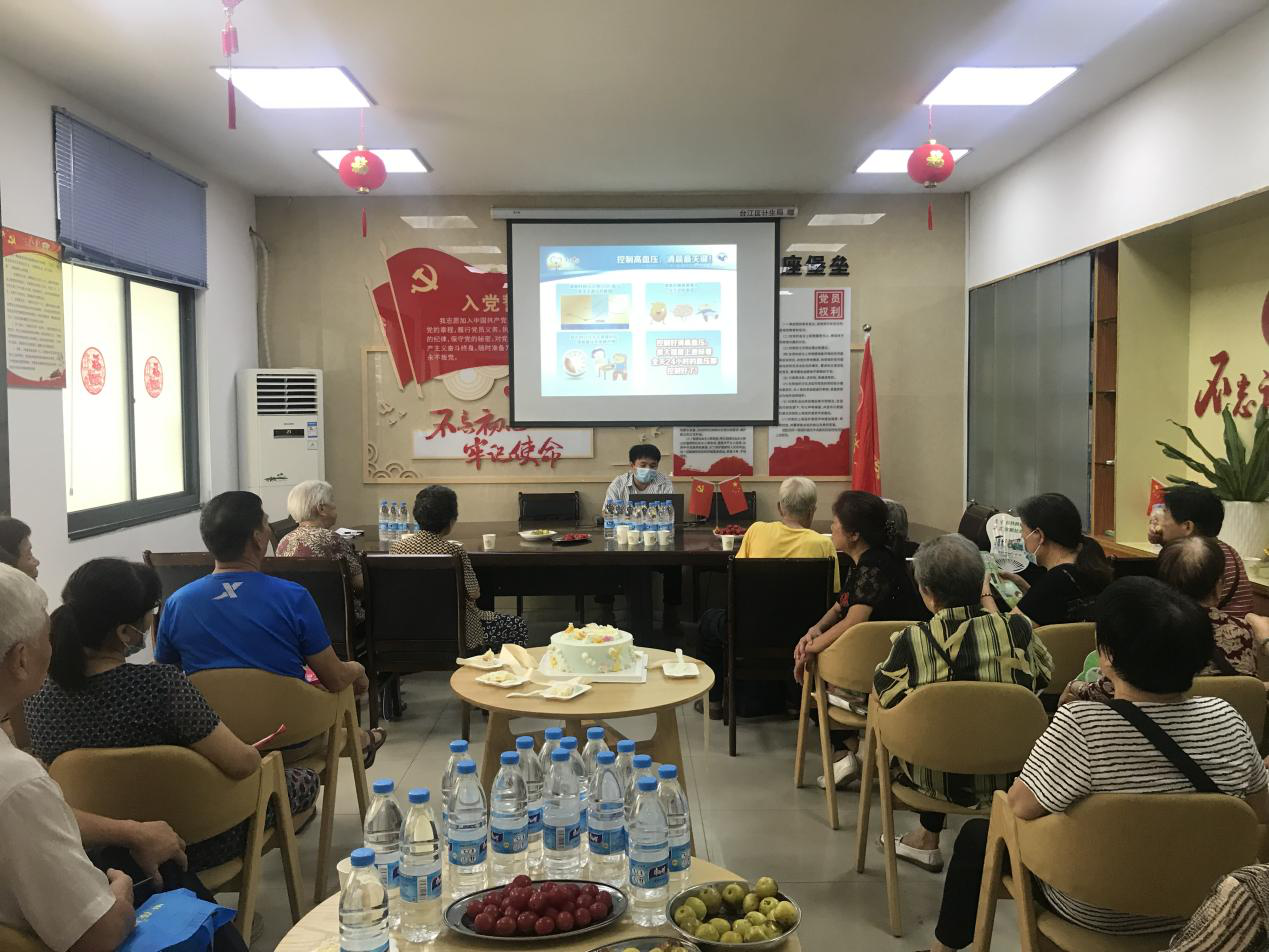为进一步提高辖区老年人的健康观念和自我保健意识,倡导科学合理健康的生活方式,让社区的老人们能拥有一个健康的身体,丰富身体保健知识。由台江区洋中街道社区卫生服务中心的医生为老人们讲授“关注血压,关爱清晨”的知识讲座,再由社区党委开展垃圾分类宣传、食品安全等各类宣传活动。活动现场,党员志愿者们还为老人们准备了水果、蛋糕和菊花茶,让老人们边品尝边参加活动,并且利用有奖问答的游戏形式演绎了老人们健康向上的时代风采,并且通过一段敬老爱老主题宣传片,烘托出活动的气氛,老同志无不动容,整个活动温馨美满,气氛热烈,其乐融融,让在场的老同志们连声叫“好”。