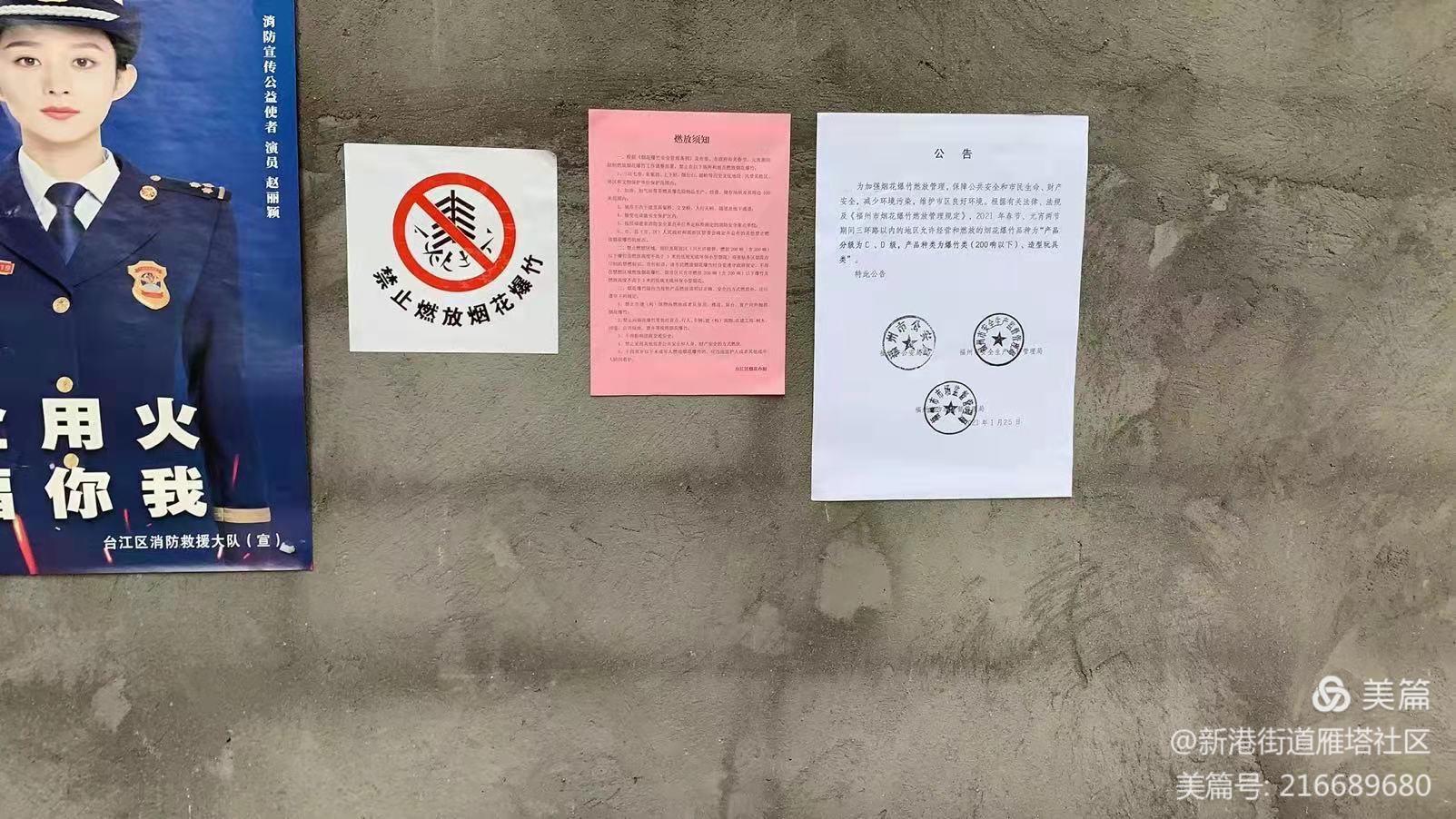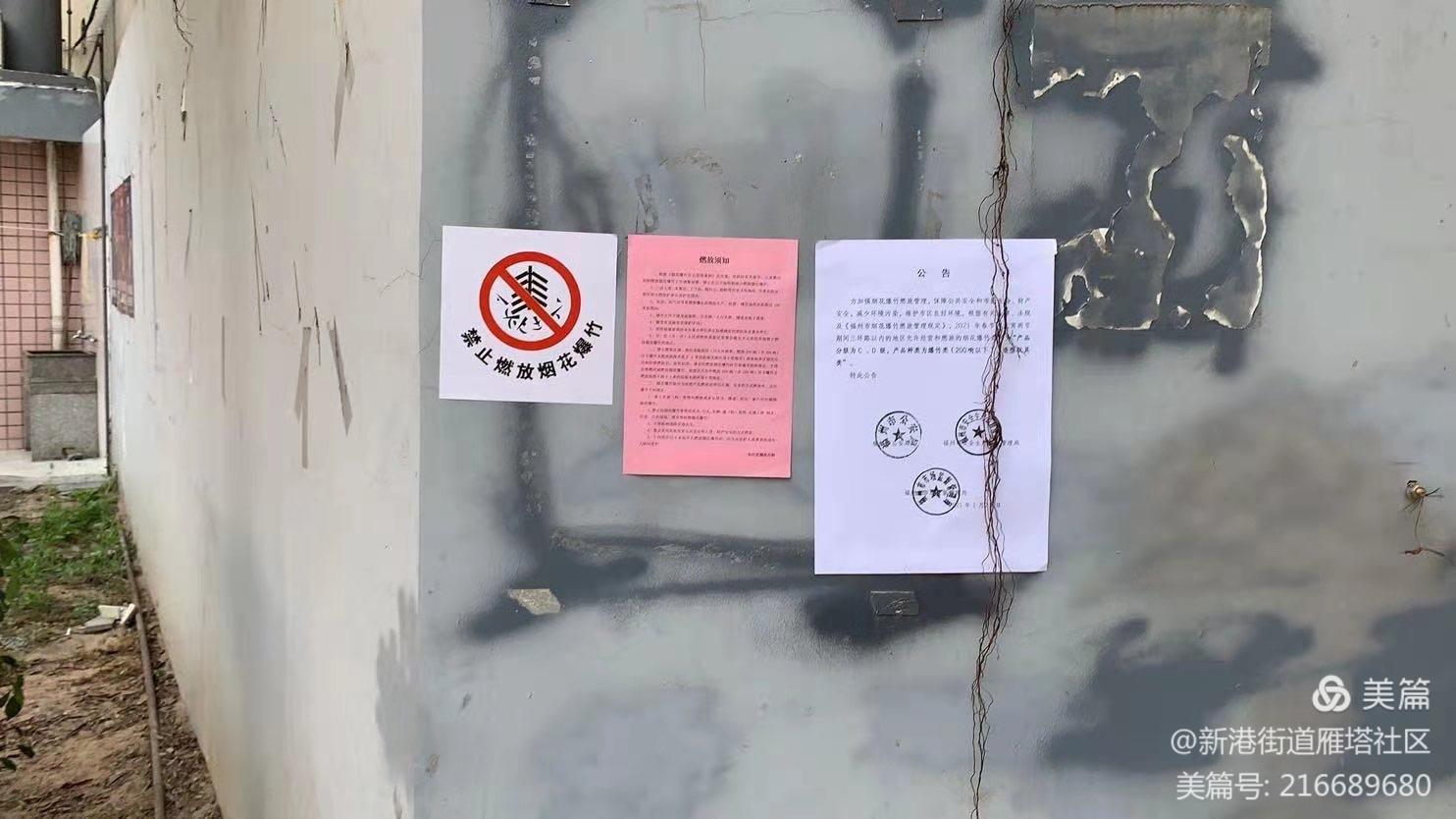 佳节临近,烟花爆竹在给我们的生活增添节日气氛的同时,也可能给我们带来火灾隐患。雁塔社区志愿者们在辖区内进行了烟花爆竹的禁燃限放宣传,包括张贴告知书及禁止燃放烟花爆竹警示贴并用土广播进行沿街宣传。