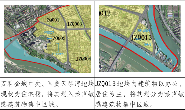 部分区域用地性质与现状实际建筑物性质不符,经调查确定为噪声敏感建筑物的,划分为噪声敏感建筑物集中区域。如JZQ002内万科金域中央、国贸天琴湾地块现状为住宅楼,将其划入噪声敏感建筑物集中区域内;JZQ006上下杭文化休闲旅游景区内有较多居民居住,将其将其划入噪声敏感建筑物集中区域内;JZQ013地块内建筑物以办公、居住为主,将其划分为噪声敏感建筑物集中区域。