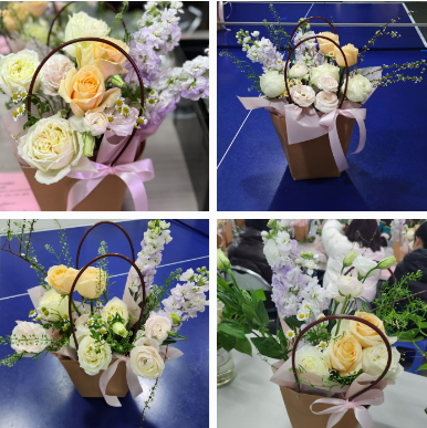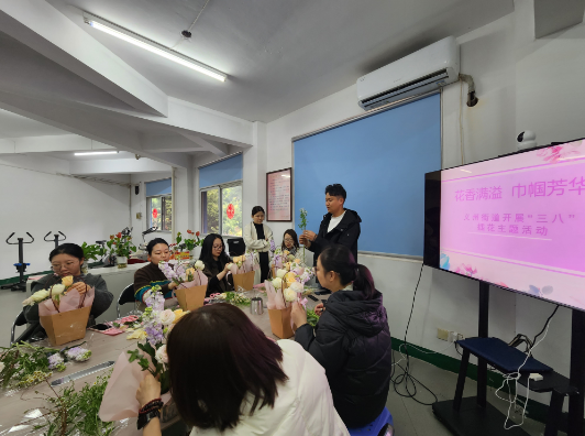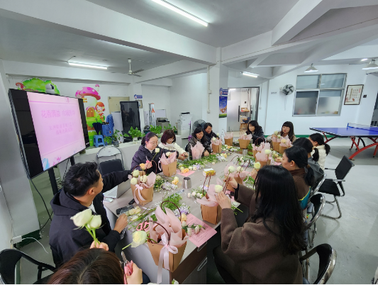 随后,花艺老师准备了各式各样的鲜花供职工们现场使用,鼓励大家发挥自己的想象力和创造力,把各色鲜花搭配组合在一起,一边研究一边创作。大家在老师的指导下结合自己的审美与创意,认真修剪枝叶、搭配花材、创意造型,互选交流创作思路。插花老师穿梭在大家中间,耐心为职工们答疑解惑,并提出作品的调整意见,帮助大家完善创作。最终,在大家的共同努力下,一支支零散的花材逐渐变成一束束错落有致、独具匠心的花艺作品。大家在花香中交流互动、欣赏作品,既陶冶情操、舒缓压力,又增进了同事情谊与团队凝聚力。