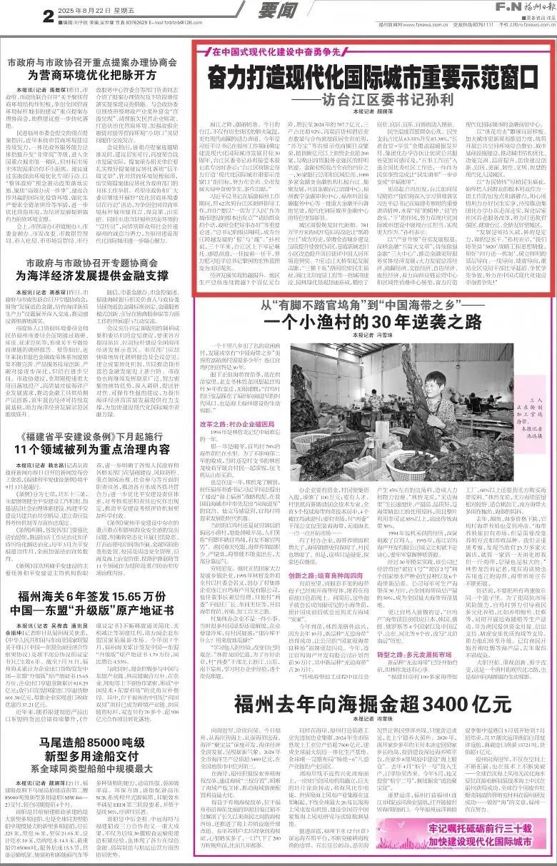 闽江之畔,潮涌帆劲。今日的台江,不仅有历史街区的烟火氤氲,更有现代商圈的活力奔涌。今年是习近平总书记在福州工作期间确定建设现代化国际城市发展目标30周年,台江区委书记孙利接受本报记者专访时表示:“台江区将锚定奋力打造‘现代化国际城市重要示范窗口’的目标,努力在全省、全市发展大局中奋勇争先、多作贡献。”