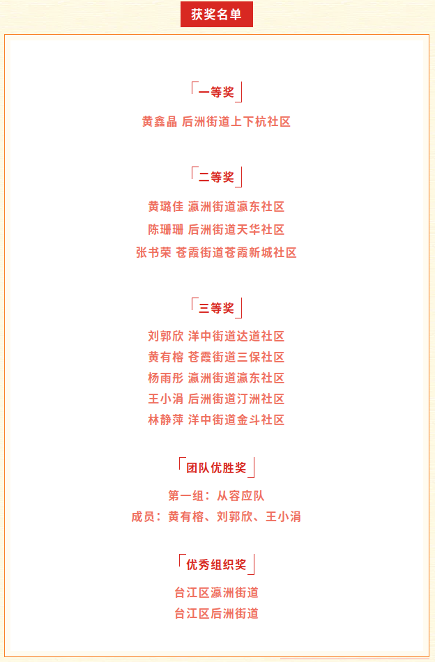 在初赛赛训中,来自台江区52个社区的82名社区工作者参与了比赛,通过个人演讲的方式,决出9人晋级决赛。决赛首创“知识竞答、情景式表演、直播式宣介”相结合的模式,全方位考察社区工作者的知识储备、语言表达、文字撰写、团队协作等综合素质能力。9名晋级选手通过激烈的角逐,最终决出个人一等奖1人、二等奖3人、三等奖5人,并评出团队优胜奖1个,优秀组织奖2个。