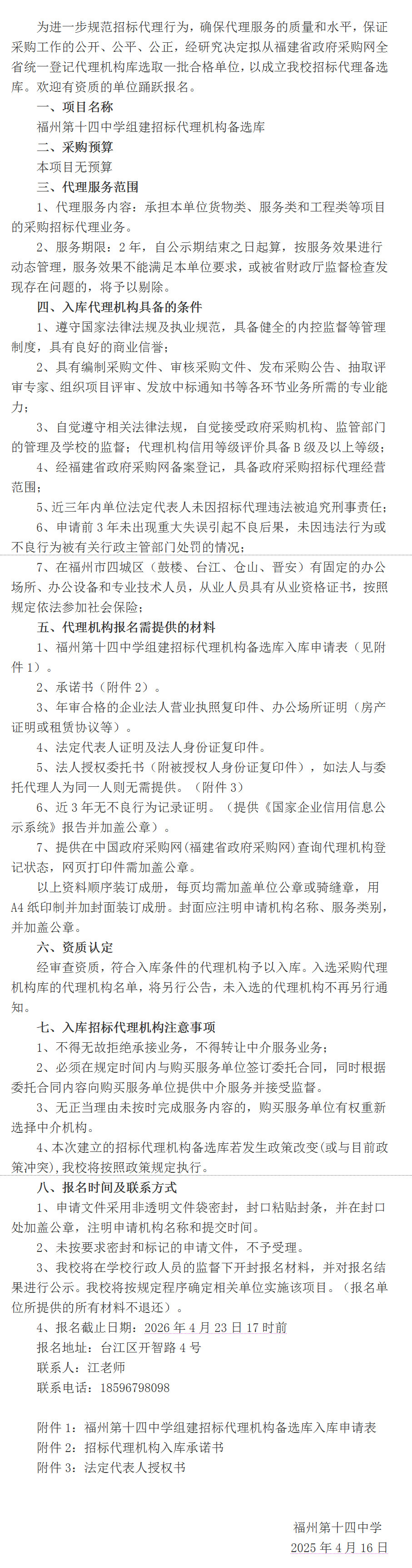 福州第十四中学关于组建招标代理机构备选库的邀请公告